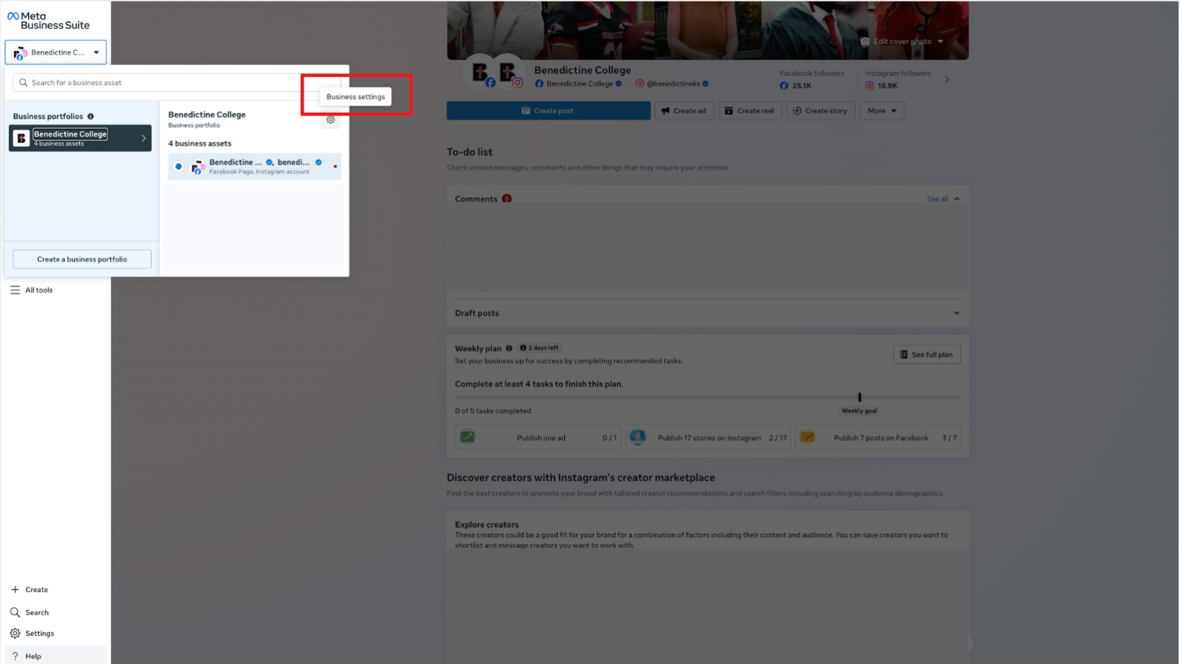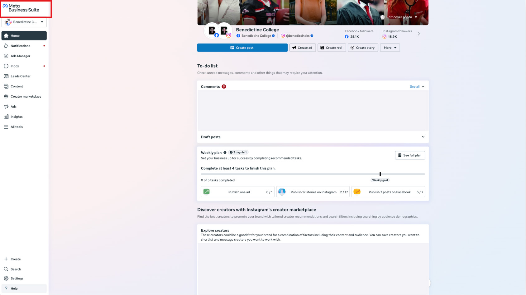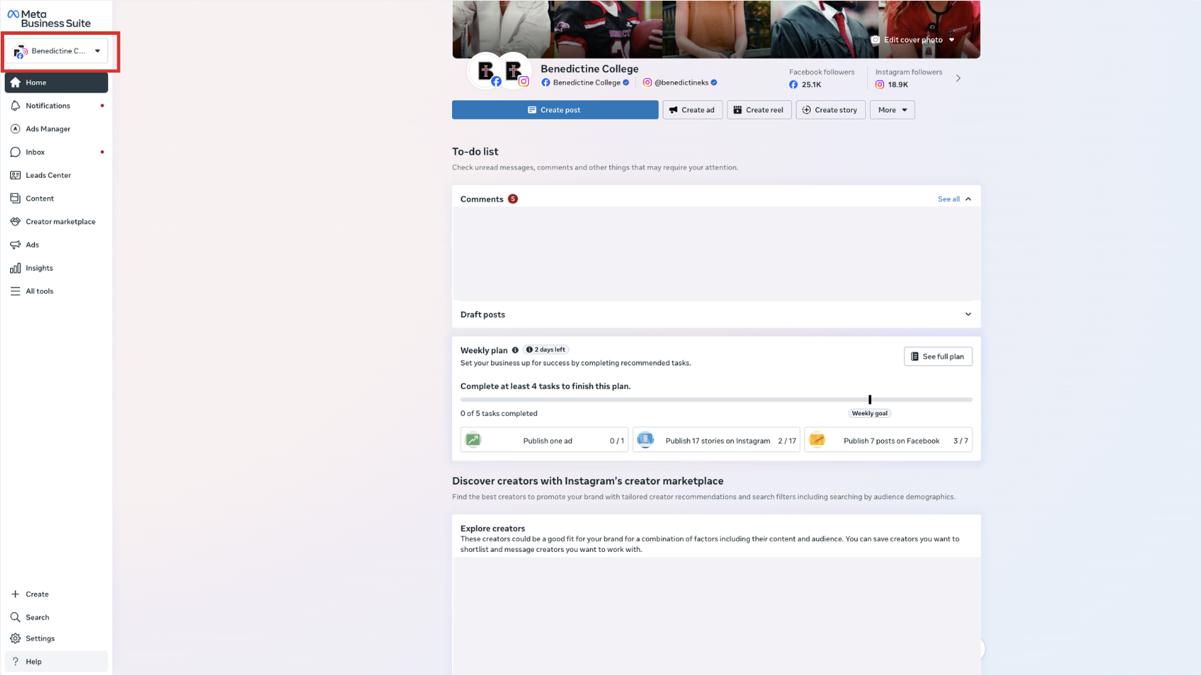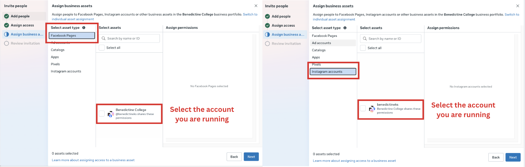5. Select the Instagram and Facebook that you are running for Benedictine.