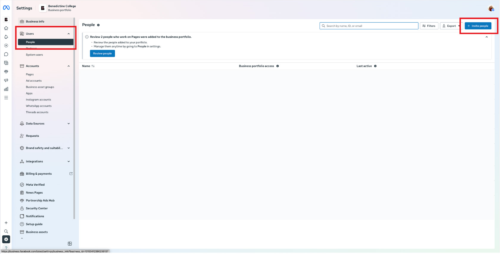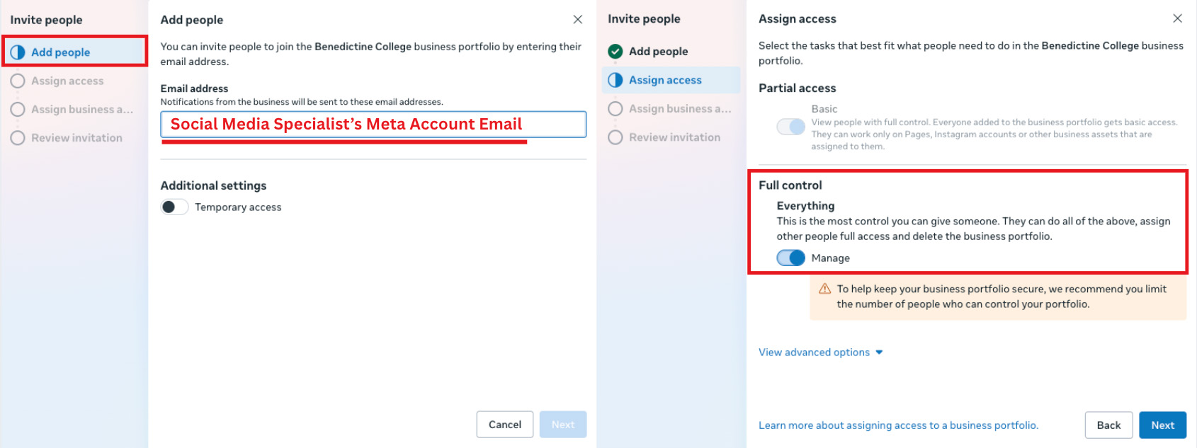 4. Enter the Social Media Specialist’s Meta Account Email (not their Benedictine email). Grant the Social Media Specialist full control of the account.