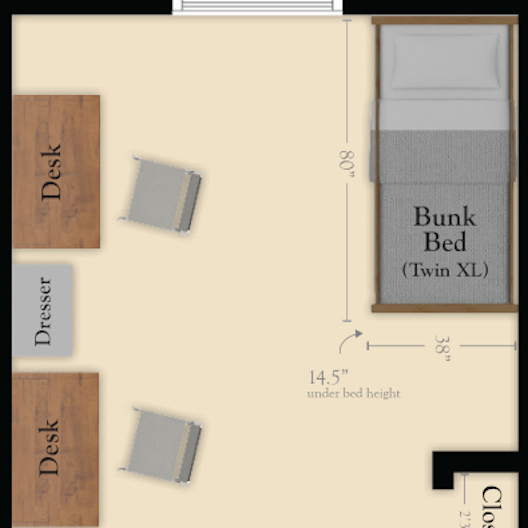 - Furniture Supplied: Bunk beds (may be unbunked upon request), two computer desks with cork bulletin boards, two desk chairs, two closets with shelving, one dresser.